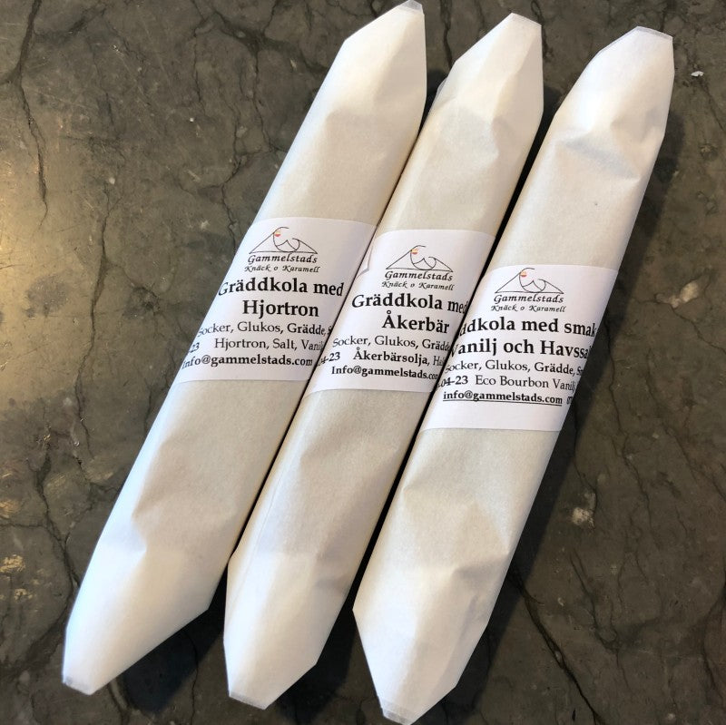 Handgjord gräddkola kokad på norrländsk grädde, bär som vuxit norr om polcirkeln och massor av smör.